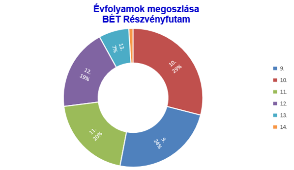 Évfolyamok tekintetében idén megoszlott arányban jelentkeztek a diákok versenyre, főként a fiatalabb, 9. (24 %) és 10. (29 %) évfolyamos diákokat tekintve; míg a 11. és a 12. évfolyamosok aránya közel azonos (19-20% között), a 13. évfolyamosok 7%, a 14. évfolyamosoké pedig 1%.
