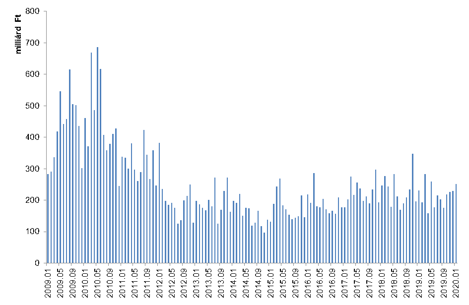 A januári 252,4 milliárd forintos összesített kereskedési érték meghaladta a megelőző hónap 229,8 milliárd forintos forgalmát, ahogy a bázis 231,5 milliárd forintos értékét is. A 11,5 milliárd forintos napi átlagos forgalom nem érte el a 2019. decemberi 13,5 milliárd forintos átlagos értéket, de a bázis 10,5 milliárd forintos napi átlagához képest azért előrelépést jelentett.